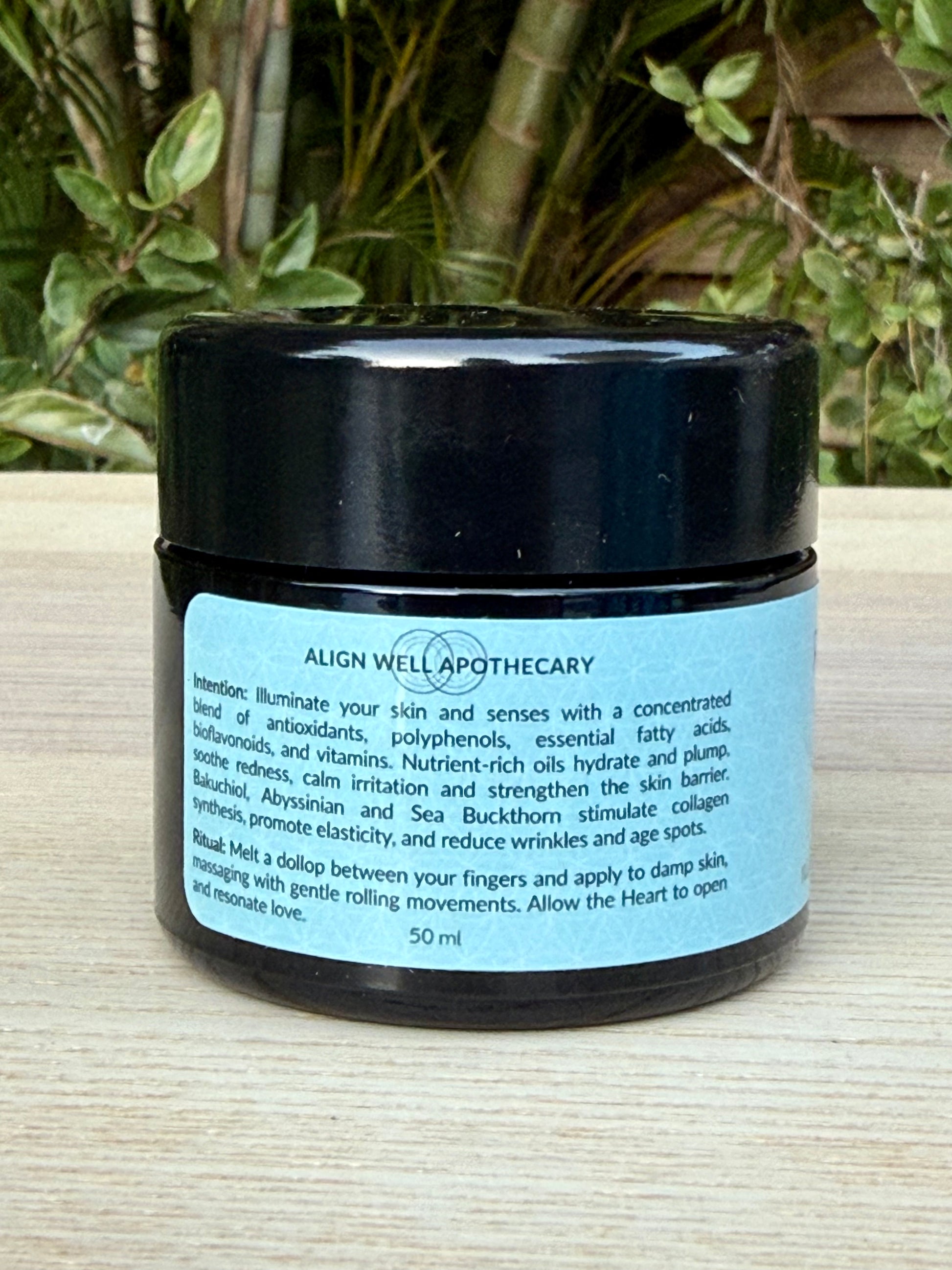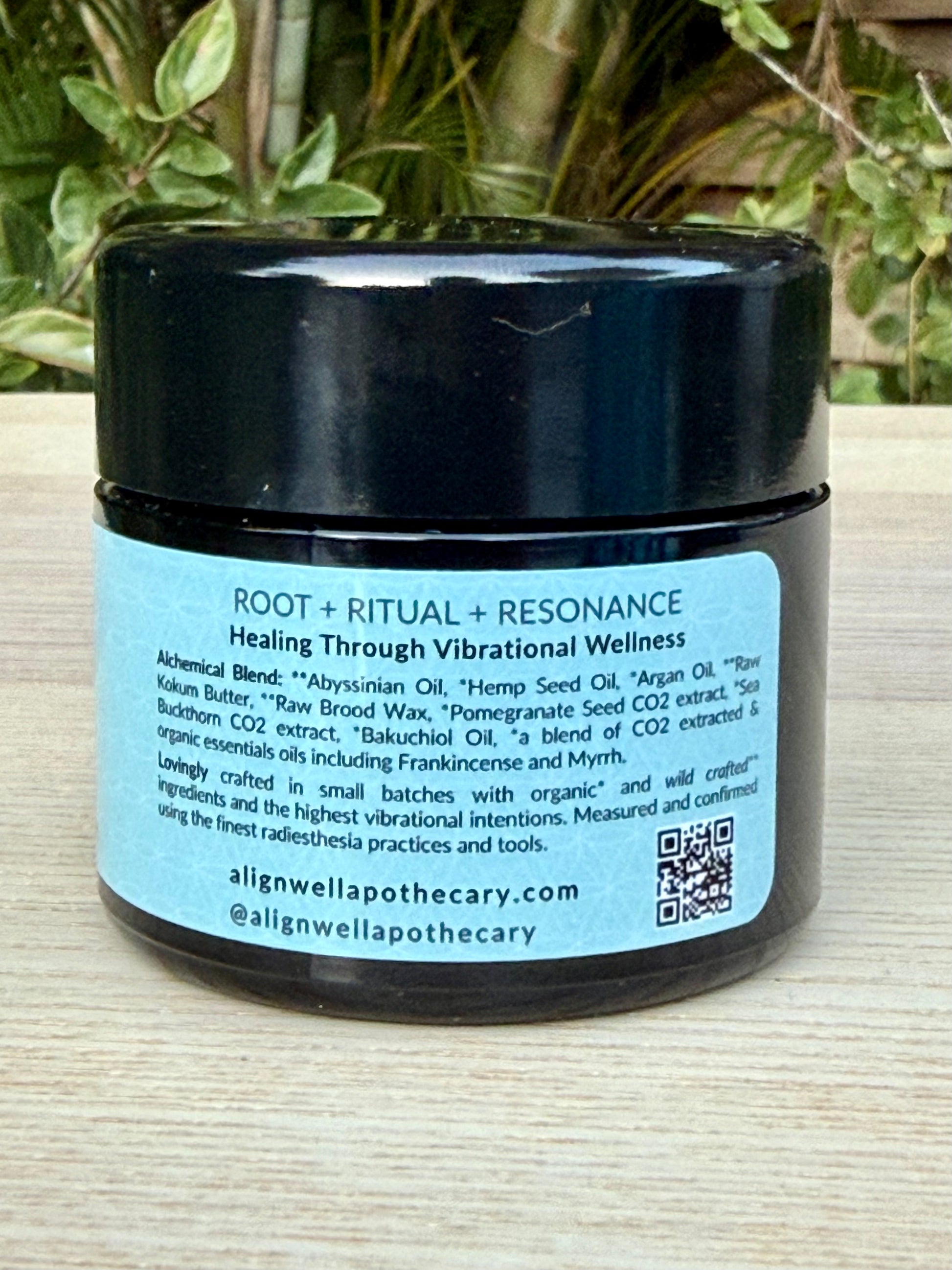 Alchemical Profile: **Abyssinian Oil, *Hemp Seed Oil, *Argan Oil, **Raw Kokum Butter, **Raw Brood Wax, *Pomegranate Seed CO2 extract, *Sea Buckthorn CO2 extract, *Bakuchiol Oil, *a blend of CO2 extracted & organic essentials oils including Frankincense and Myrrh. *organic , **wildcrafted